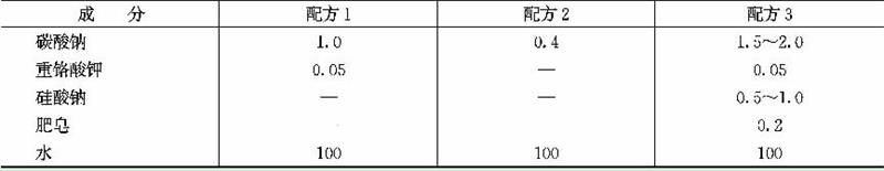 (2)堿性溶劑,它是堿或堿性鹽的水溶液。利用堿性溶液和零件表面上的可皂化油起化學(xué)反應(yīng),生成易溶于水的肥皂和不易浮在零件表面上的甘油,然后用熱水沖洗,很容易除油。對不可皂化油和可皂化油不容易去掉的情況,應(yīng)在清洗溶液中加入乳化劑,使油垢乳化后與零件表面分開。常用的乳化劑有肥皂、水玻璃(硅酸鈉)、樹膠等。清洗不同材料的零件應(yīng)采用不同的清洗液。堿性溶液對于金屬有不同程度的腐蝕作用,尤其對鋁的腐蝕較強。表1-1和表1-2分別列出清洗鋼鐵零件和鋁合金零件的配方,供使用時參考。