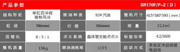 簡介—— 動力-SR170F/P-2(D)優(yōu)勢:1.優(yōu)良的吸排氣效果,大幅度提高燃燒效率。2.氣缸、空濾器、消音器以及燃油箱的設(shè)計